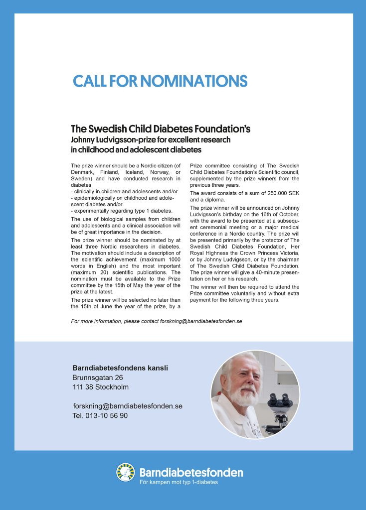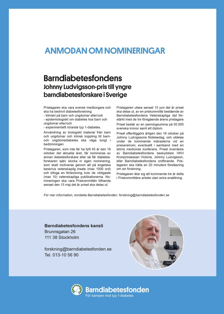 - The Johnny Ludvigsson Prize for excellent research in childhood and adolescent diabetes till en forskare i Norden, och Barndiabetesfondens Johnny Ludvigsson-pris till yngre barndiabetesforskare i Sverige.