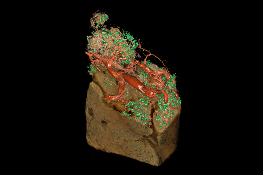 Forskargruppen har nu utvecklat tekniker för att med antikroppar specifikt färga in de Langerhanska öarna i mer än kubikcentimeter stora preparat av mänsklig bukspottkörtelvävnad (se bild). Genom OPT avbildning av sådana preparat i ”nära infrarött” ljus kan man skapa tomografiska 3D avbildningar som innehåller information om tiotusentals öars specifika volym, form, och rumsmässiga fördelning i ett och samma försök. Forskarnas data visar att sådana tomografiska dataset i sin tur bör kunna kombineras med varandra i en dator för att återskapa bukspottkörtelns fullständiga anatomi med avseende på de Langerhanska öarnas volym och utbredning.