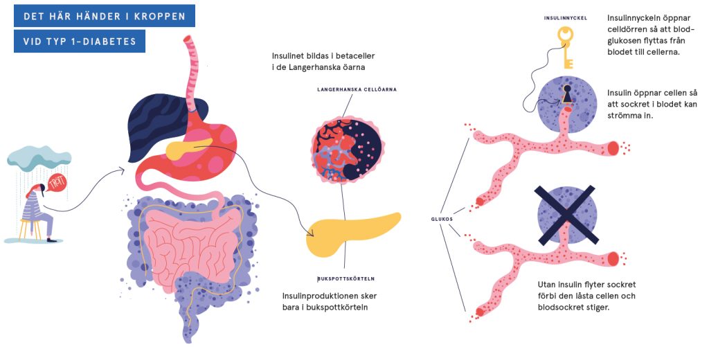 Hos friska personer regleras insulinproduktionen automatiskt och blodsockret hålls på en mycket jämn nivå, men hos personer med typ 1-diabetes har insulinproduktionen slutat fungera. Därför behöver de själva tillföra insulin med spruta eller pump, dygnet runt, livet ut.